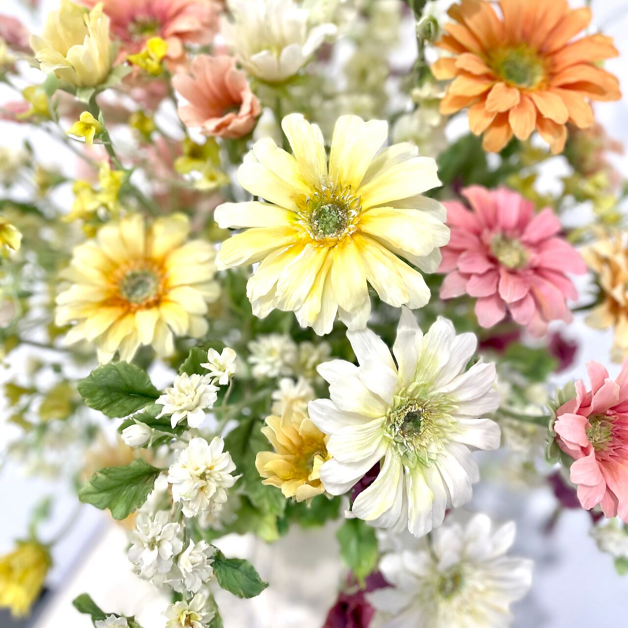 春のお訪れをイメージする盛花です。ガーベラとスゥイートピーのアレンジメントにオンシジウムとモッコウバラを加えました。優雅で可憐な花々が、優しい色合いでお部屋を明るく華やかに演出します。